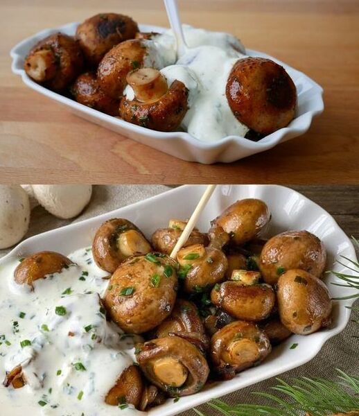 2. Jetzt alles zusammenrühren. Abschmecken. Die Soße über die heißen Champignons geben und genießen. Fertig