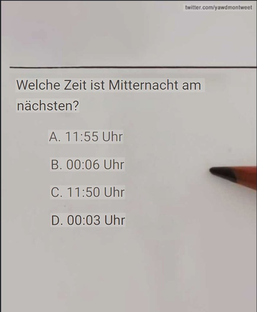Die Internetnutzer wurden in ihre Schulzeit zurückversetzt, als eine verwirrende Frage nach der Zeit eine breite Debatte auslöste. @yawdmontweet, ein jamaikanischer Nutzer, stellte die Frage, die ihn ratlos zurückließ: « Was ist die nächste Zeit bis Mitternacht? ».