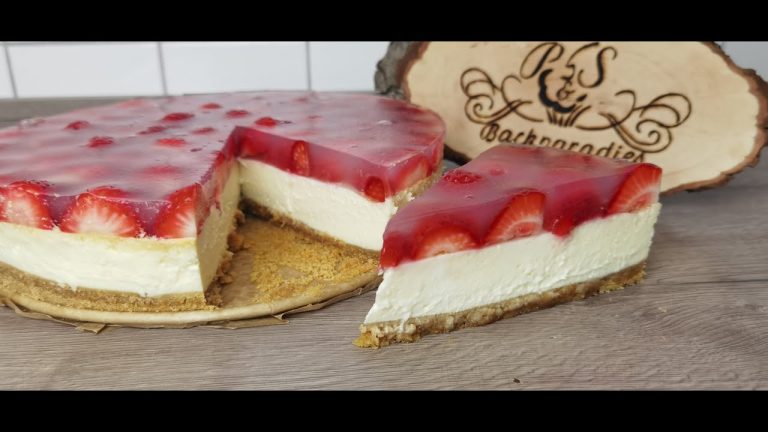 Für das Topping die Erdbeeren in dünne Scheiben schneiden und von außen in Kreisen auf die Creme legen. Den roten Tortenguss gemäß Packungsanleitung vorbereiten und direkt über die Erdbeeren geben. Den Guss fest werden lassen, dann aus der Form lösen und bis zum Servieren kaltstellen. Der Kuchen ergibt ca. 12 Stücke.