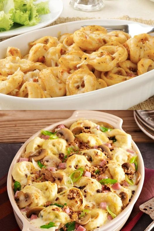 3. Nun die Tortellinis nach Anweisung der Packung kochen, falls diese nicht vorgekocht gekauft wurden, anschließend in einer große Auflaufform geben. Den Inhalt der Pfanne aufkochen lassen, wenn es notwendig ist etwas Soßenbinder oder Mehl hinzugeben,