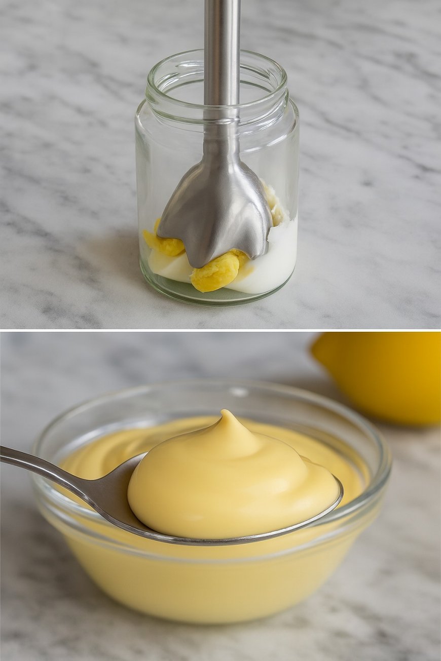 Pürieren: Die gehackten hartgekochten Eier, den griechischen Joghurt, den Zitronensaft und eine Prise Salz in einem hohen Gefäß, z. B. einem Stabmixer, vermengen.