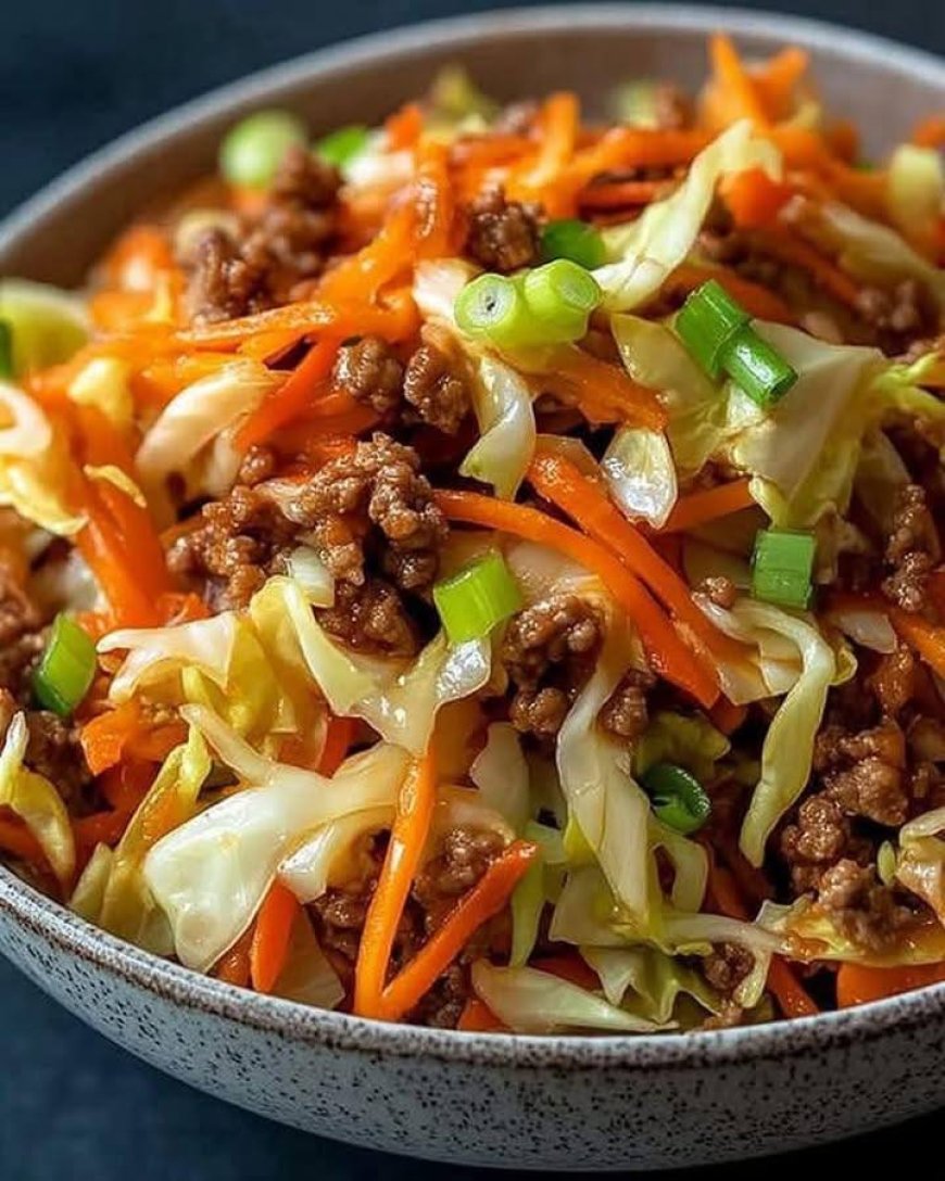 ein schnelles, aromatisches und zugleich gesundes Gericht, das sich perfekt für den Alltag eignet. Saftig gebratenes Hackfleisch wird mit frischem Weißkohl, knackigen Karotten und Frühlingszwiebeln kombiniert. Durch die würzige Sauce aus Sojasauce, Knoblauch, Ingwer und Sesamöl erhält dieses Gericht seinen unverwechselbaren asiatischen Geschmack.