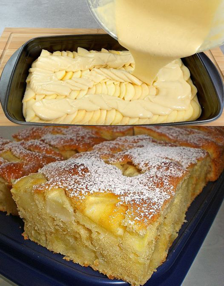 1. Einfach mal alle Zutaten der Reihenfolge nach miteinander zu einem Rührteig verrühren. Dann die kleingeschnittenen Äpfel unter den Teig heben. Jetzt alles auf ein mit Backpapier ausgelegtes Backblech streichen.