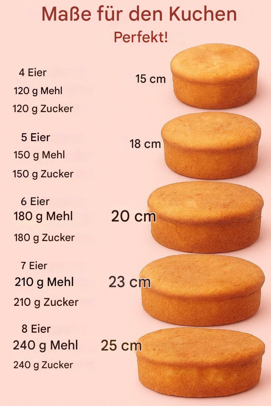 Dieses Rezept zeigt dir, wie du je nach gewünschter Kuchenform und Personenanzahl die richtige Menge an Zutaten dosieren kannst – von kleinen 15 cm Backformen bis hin zu großen 25 cm Formen. Dabei bleibt das Grundprinzip immer gleich: Eier und Zucker werden schaumig geschlagen,