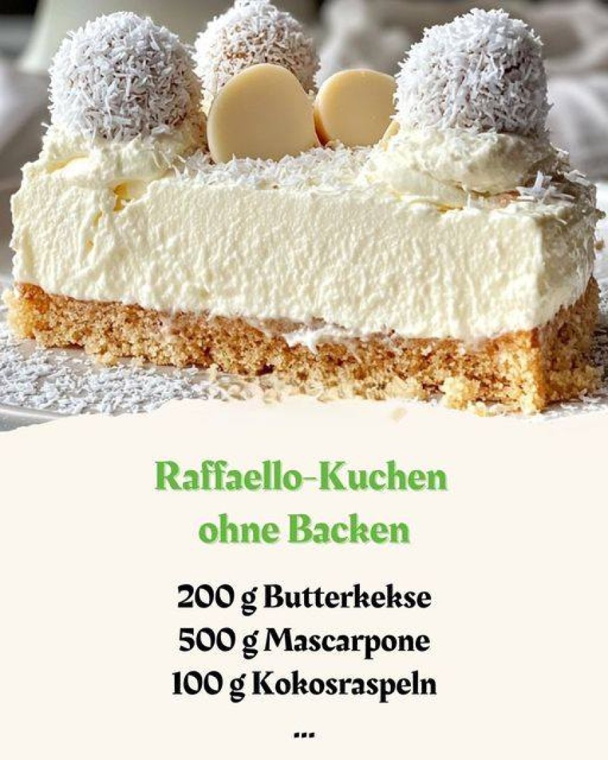 Der Raffaello-Kuchen ohne Backen ist ein Dessert, das mit seiner Cremigkeit und Einfachheit überzeugt. Perfekt für alle, die Kokos lieben, besteht er aus einem knusprigen Keksboden und einer leichten Kokoscreme, die an die beliebten Raffaello-Pralinen erinnert. Highlights: Kein Backen nötig: Schnelle Zubereitung ohne Ofen – ideal für warme Tage oder spontane Gäste. Traumhaft cremig: Die Mischung aus Mascarpone, Sahne und Kokosraspeln sorgt für eine zarte, luftige Konsistenz. Dekorativ und lecker: Mit Raffaello-Pralinen, Kokosraspeln oder Mandeln dekoriert wird der Kuchen auch optisch zum Highlight. Dieser Kuchen passt zu jedem Anlass, ob Geburtstag, Kaffeekränzchen oder als Nachtisch für die Familie. Nach ein paar Stunden im Kühlschrank ist er schnittfest, herrlich cremig und lässt sich problemlos servieren. Ein Genuss, der garantiert begeistert!