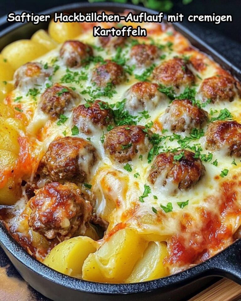 Dieser saftige Hackbällchen-Auflauf mit cremigen Kartoffeln ist die perfekte Mischung aus herzhaften Aromen und wohltuender Cremigkeit. Die zarten Hackbällchen in Kombination mit sahnigen Kartoffeln und würzigem Käse machen dieses Gericht zu einem echten Lieblingsessen, das alle am Tisch begeistern wird.