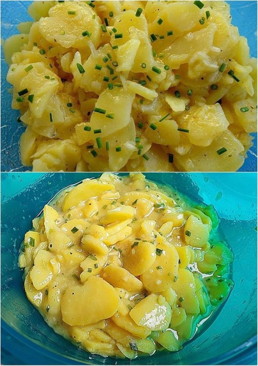 Kartoffelsalat anrühren: Die lauwarmen Kartoffelscheiben kommen nun in die vorbereitete Schüssel, in der die Marinade bereits wartet. Vermengen Sie die Kartoffelscheiben vorsichtig mit den Gewürzen und der Brühe, sodass alle Kartoffeln gut durchzogen sind. Achten Sie darauf, dass die Brühe nicht zu wenig, aber auch nicht zu viel ist – der Kartoffelsalat muss schön „schlotzig“ bleiben, damit er nicht zu trocken wird.