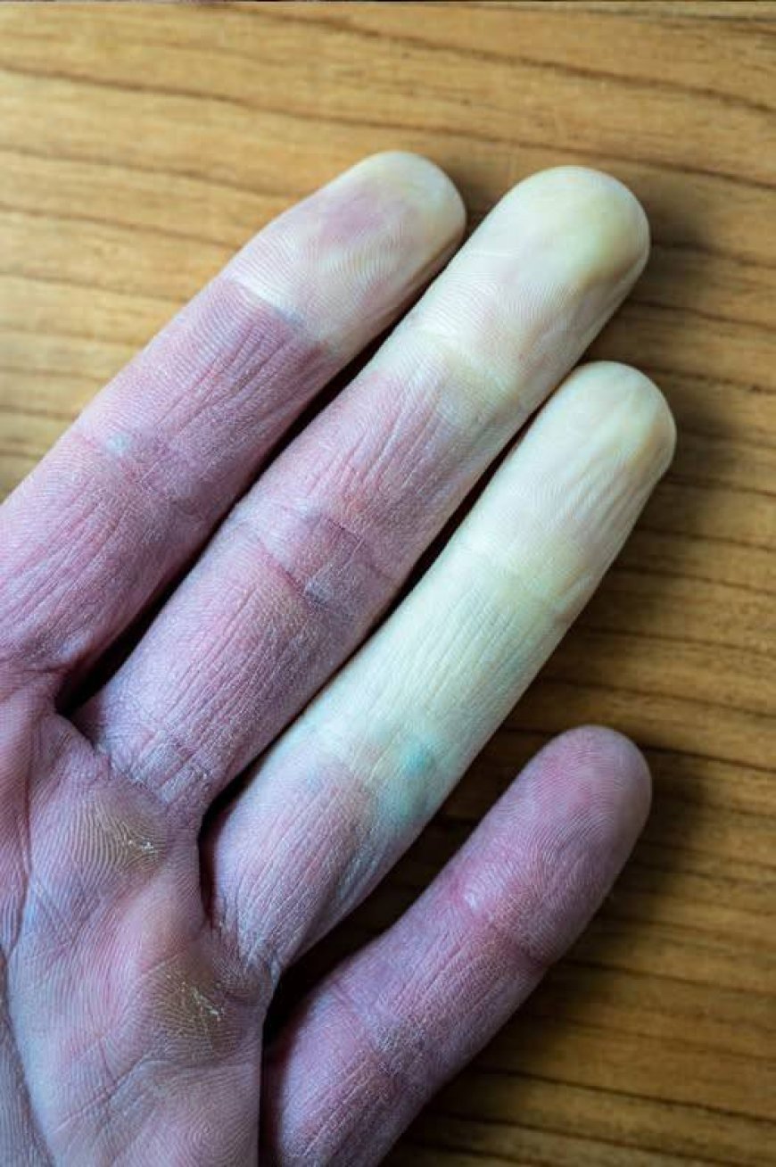färben sich weiß oder sogar blau, bevor sie nach dem Erwärmen wieder ihren normalen Farbton annehmen. Dies kann einige Minuten dauern, manchmal bis zu fünfzehn Minuten.