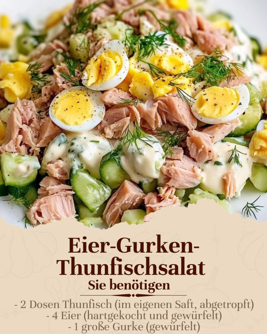 Dieser Eier-Gurken-Thunfischsalat ist nicht nur unglaublich lecker, sondern auch in wenigen Minuten zubereitet. Die Kombination aus herzhaftem Thunfisch, cremigem Dressing, knackiger Gurke und würzigen Eiern sorgt für einen unvergleichlichen Geschmack. Perfekt als leichtes Mittagessen, Beilage oder proteinreicher Snack! Hier kommt die ausführliche Schritt-für-Schritt-Anleitung mit zusätzlichen Tipps für ein optimales Ergebnis.